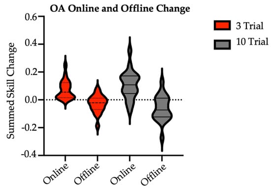 Sum of older adult online and offline skill changes with practice by group. OA = older adult (main study). There were no between-group differences at significance of 0.05. Online skill change was calculated as the difference in skill between the last trial and the first trial of a given session. Online values were summed over Session 1 through Session 7 retention. Offline skill change was calculated as the skill difference between the first and last trials of consecutive sessions. Offline values were summed over Sessions 1 through 7 retention.