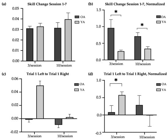 Age-related difference in change in skill with practice. * indicates significance at 0.05. OA = older adults (main study); YA = younger adults. (a) Difference in average raw skill in trained task from Session 1 (baseline) to Session 7 (retention) in older and younger adults. (b) Difference in average normalized skill in trained task from Session 1 (baseline) to Session 7 (retention) in older and younger adults. (c) Difference in first baseline trial (left) and first transfer trial (right) in older and younger adults. (d) Normalized difference in first baseline trial (left) and first transfer trial (right) in older and younger adults.