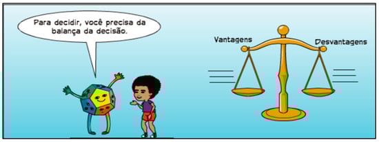Example II of the psychoeducation tool (Executive functions: “To decide, you need the decision balance.” Balance: “Advantages” and “Disadvantages”).