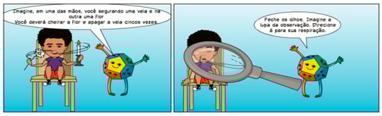 Example III of the psychoeducation tool (Executive functions, box 1: “Imagine, in one hand, you’re holding a candle, and in the other, a flower. You must smell the flower and blow out the candle five times.” Executive functions, box 2: “Close your eyes. Imagine the observation lens. Direct it towards your breath.”).