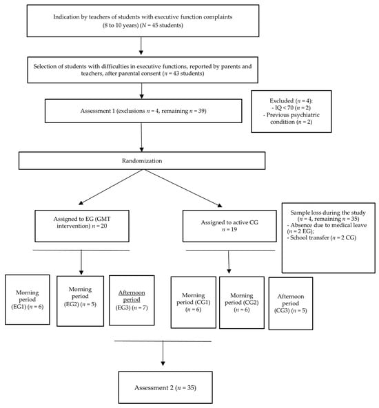 Of the 45 children initially recommended by the teachers, two parents did not agree to their participation in the study. Therefore, the study continued with 43 students. A series of neuropsychological measures were applied before and after the interventions to characterize the participants and assess the impact of the intervention program. Criteria for the exclusion of students included presenting a previous psychiatric condition, Intelligence Quotient (IQ) below 70, a history of neurological injury, or disorders according to the school’s or parents’ report. Two participants were excluded from this study after the teachers’ indication due to a previous psychiatric condition reported by the school, and two participants were excluded after the first assessment due to presenting an IQ below 70. Two children were absent from school for health reasons and two children changed schools, throughout the intervention phase, resulting in their withdrawal from the study, including two children from the control group and two from the experimental group. The final sample was composed of 35 children. Participants did not undergo any other psychological intervention during the study.
