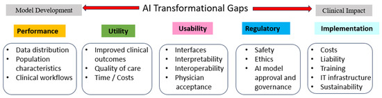 There is a significant challenge in translating AI innovations into routine patient care. The transformational gap refers to the gap between developing an artificial intelligence/machine learning model in a research setting and successfully deploying it in real-world clinical practice. Some key aspects of the transformational gap include (Figure 1):