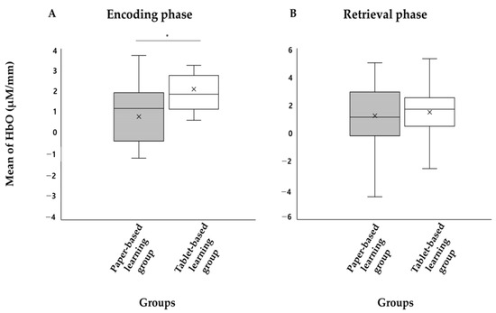 Figure 2. Boxplots of the effect of learning media on encoding (A) and retrieval phase (B). * p < 0.05.