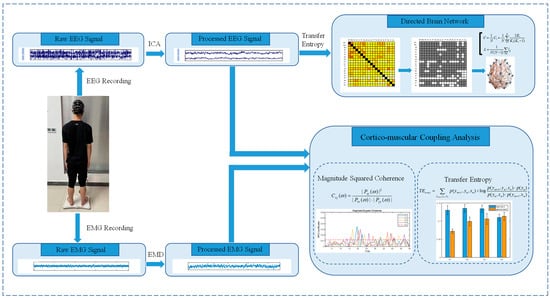 This section briefly introduces the general idea of this study. First, EEG and EMG signals were acquired synchronously. Second, EEG and EMG data were preprocessed to remove noise. Then, CMC and TE were used to analyze functional cortico-muscular coupling and transmission. Studies have shown that there is coherence between the EEG channel CZ and the EMG of distal muscles of the lower limbs [19], so we chose the EEG channel CZ to calculate the strength of the cortico-muscular coupling with lower limb muscles. Finally, a functional brain network was constructed to analyze the network characteristics of standing balance regulation. The general framework of the experiment is shown in Figure 1.