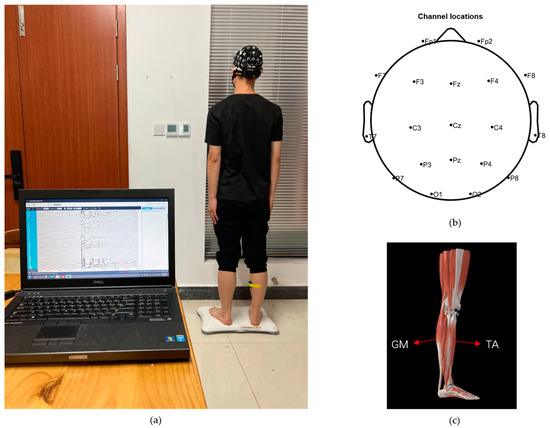 Maintaining standing balance is a closed-loop control process that requires the central nervous system to receive vestibular, proprioceptive, and visual information to control muscle contraction to overcome disturbances in the external environment and ultimately stabilize the body. When peripheral sensory feedback decreases, it becomes more difficult for the human body to maintain postural stability. Due to the lack of an experimental paradigm that can block the vestibular sense in humans, we merely blocked visual input and proprioceptive input from the soles of the feet by having the participants close their eyes and laying sponge pads under their feet, respectively. The four balance paradigms are shown in Table 1. A 64-lead EEG acquisition instrument (Neusen. W64, Neuracle, Changzhou, China) was used to obtain EEG signals, and the sampling frequency was set to 1000 Hz. Before data acquisition, the detection electrodes needed to be prepared with conductive paste to make the impedance lower than 5 . The electrodes were distributed according to the 10–20 international standard. Data from 19 channels (FP1, FP2, FZ, F3, F4, F7, F8, CZ, C3, C4, T7, T8, PZ, P3, P4, P7, P8, O1, and O2) were selected for analysis. These selected electrodes are representative of the somatosensory and motor areas [20]. Channel distribution is shown in Figure 2b. The EMG acquisition device (Delsys Inc., Natick, MA, USA) is a wireless surface EMG sampling system, with a sampling frequency of 2148 Hz., The epidermis over each muscle of interest was wiped with alcohol before data collection. EMG signals were acquired from the gastrocnemius (GM) and tibialis anterior (TA). These muscles exhibit high levels of activity during the process of posture adjustment [21]. The location of the muscles is shown in Figure 2c.