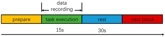 Each subject stood on the balance board with their legs shoulder-width apart and parallel, with both hands hanging down naturally beside their thighs. The synchronous collection of experimental data began when the subject was able to stand stably. Each subject completed the tasks of the P1–P4 in order. For each paradigm, the experiment required the synchronous collection of EEG and EMG for 15 s. Each paradigm required the subject to perform 10 repetitions, and after each period of data collection, the subject took a 30 s rest period to avoid muscle fatigue. In the P1 and P3 paradigms, the subject was instructed to look straight ahead at a reference object with both eyes. If any event, such as a fall or a cough, interrupted data collection during the experiments, the experimental data were invalidated, and the test was repeated after a period of rest. The experimental process is shown in Figure 3. In addition, the height of the sponge pad was 10 cm and its density was 30 .