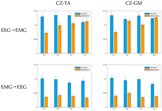 On the basis of CMC analysis, the EEG and EMG data were filtered into the beta band and the gamma band. The mean TE from cortex to muscle (EEG → EMG) and from muscle to cortex (EMG → EEG) in the beta band and the gamma band under the four balance paradigms is shown in Figure 5. It can be seen that there is indeed a bidirectional coupling relationship between the cerebral cortex and the muscles of the lower limbs, forming a sensorimotor control loop. Regardless of the paradigm, the mean value of TE from EEG to EMG is greater than that from EMG to EEG in both the beta band and gamma band. In the four balance tasks, the coupling value of the cortex and muscles in the beta band was the largest in both the ascending neural pathway and the descending neural pathway.