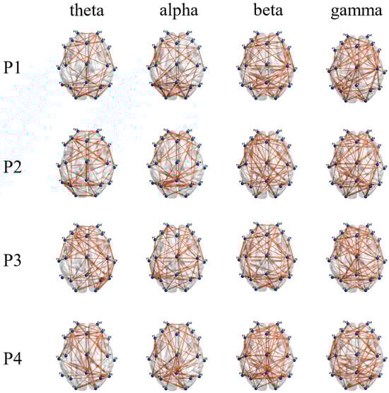 In this paper, functional brain networks were constructed based on TE between 19 EEG channels, and network characteristics were calculated. It was found that network connections of different frequency bands were concentrated in different brain regions, which may be the result of functional brain differentiation and complex network properties [35]. It has been confirmed that when the brain performs more difficult cognitive tasks, the brain network will show higher global efficiency [36]. The increase in the average clustering coefficient and the decrease in the average characteristic path length both indicate that the efficiency of brain network information processing is improved [37]. The experimental results of the P1–P4 paradigms in this paper showed that as balance difficulty increased, the C of the beta band increased significantly, and L decreased significantly. Due to the increased difficulty of balance, the cerebral cortex needed to mobilize more sensorimotor resources and concentration, and the information processing ability of the entire brain area in the beta band was enhanced. The brain network in the beta band exhibited the highest global efficiency, with the strongest interactions and synchronous activity between brain regions. In addition, brain network activity in the alpha band showed higher global efficiency during P2 and P4 than during P1 and P3, which may be related to the influence of visual stimulation on alpha wave oscillation [38].