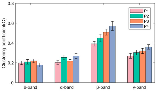 As shown in Figure 6, the network connections of the theta band and alpha band are concentrated in the frontal and occipital regions, while the beta band and gamma band also have significant network connections in the central region. It can be seen in Figure 7 that when subjects performed balance paradigms of different difficulty, the mean of the C of the beta band was the largest, followed by that of the gamma band. As the difficulty of the balance paradigm increased, the C of the beta band significantly increased (* p < 0.05).
