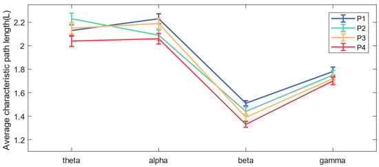 In addition, comparing the mean of the functional brain network L in each frequency band under the four balance paradigms in Figure 8, we concluded that the mean L in the beta band was the smallest, while the L of the beta band decreased significantly (* p < 0.05) as the difficulty of the balance paradigm increased.