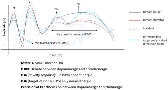 Unlike the MMN, there is much discussion surrounding the neurotransmitters influencing the P300. An early review talked about the influence of the different neurotransmitter systems on the P300 [39]. They claimed that the P300 potential was directly influenced by the glutaminergic system since they are a direct result of excitatory post-synaptic potentials and indirectly by the GABA-ergic system through their inhibitory influence on excitatory post-synaptic potentials. In a seminal paper by Polich, he states that the P3a may be driven by the dopaminergic system and the P3b by the noradrenergic system [36]. This is backed up pharmacological and neuromodulatory interventions, showing the possible role of dopamine and noradrenaline in encoding the late positive potential [40,41]. Specifically, using an active inference model, a recent study shows how prediction errors trigger noradrenaline activity in the locus coeruleus which subsequently alters the rate of learning about the environment [42]. At a systems level, the noradrenergic activity of the locus coeruleus has been correlated with the amplitude of P3b [43].