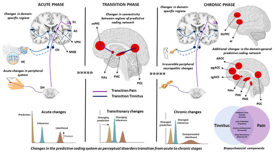 This figure summarises the neural markers and changes in the predictive coding system involved in the acute, transition and chronic phase of tinnitus and pain. In the acute phase, damage to the cochlear hair cells or an acute injury increase spontaneous activity in the peripheral system which is brought to consciousness by the domain-specific lateral pathway (blue = auditory, purple = somatosensory). Specific to predictive coding, there is an increase in the precision of the likelihood. In the transition phase, there are specific changes to connectivity between regions of the predictive coding network. In pain, the connectivity between mPFC and NAc predicts the transition from acute to chronic with over 80% accuracy. In tinnitus, a change in the connectivity between the PHC and PCC was noted in a cross-sectional study comparing acute and chronic patients. From a predictive coding perspective, there is a change in the prediction (from silence to perceiving a phantom) accompanied by a change in inference owing to a possible reinforcement learning facilitated by the limbic system. In the chronic phase, damaged peripheral nerves in the auditory and somatosensory systems cause a domain-specific central sensitisation, which together with a malfunctioning inhibitory pathway from the DLPFC or the pgACC for tinnitus and pain, respectively, bring the increased gain to consciousness. It is accompanied by a myriad of biopsychosocial components and a domain-general distress network (shown in red) whose regions also overlap with the predictive coding network. From a predictive coding perspective, the current prediction has now fully transitioned to expect the perception of the phantom as the new norm, thereby compensating for the increased precision of the likelihood and changing the inference as well. The abbreviations involved are HC = hair cells, DH = dorsal horn, S1 = primary somatosensory cortex, AC = primary auditory cortex, VPN = ventral posterior nucleus, MGB = medial geniculate body, CN = cochlear nucleus, mPFC = medial prefrontal cortex, NAc = nucleus accumbens, DLPFC = dorsolateral pre-frontal cortex, aI = anterior insula, dACC = dorsal anterior cingulate cortex, pgACC = pregenual anterior cingulate cortex, sgACC = subgenual anterior cingulate cortex, PHC = parahippocampal cortex, PCC = posterior cingulate cortex, PAG = periaqueductal gray.