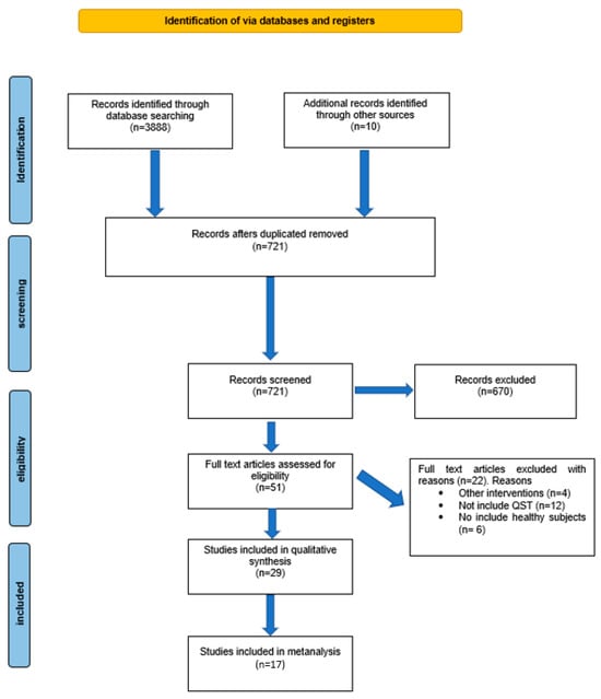 Electronic searches identified 3888 potential studies for review. After elimination of duplicates, a total of 721 studies remained. A total of 670 studies were excluded on the basis of their titles/abstracts, leaving 51 articles for full-text analysis. Another 22 studies were excluded because they studied interventions other than tDCS, did not include QST assessment, or did not include healthy subjects.