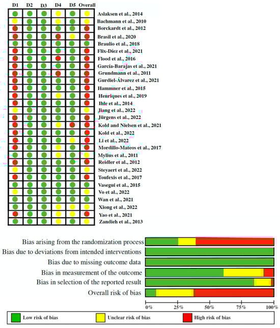 Risk of bias results of the included studies [,,,,,,,,,,,,,,,,,,,,,,,,,,,,]. Green color = low risk of bias; Yellow Color= unclear risk of bias and Red color= High risk of bias.