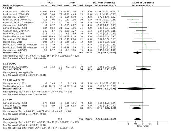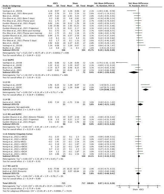 A meta-analysis was performed for each measurement and for each type of stimulation: anodic or cathodic. Subgroup analyses were performed for stimulation area and intensity. Subgroup analysis by number of sessions was not performed because almost all studies conducted a single session. Meta-analysis was performed using the inverse variance method and a random-effects model with 95% confidence intervals, as it provided more conservative results in the case of heterogeneity between studies, which was expected. p values < 0.05 were considered statistically significant. An effect size (SMD) of 0.8 or greater was considered large, an effect size between 0.5 and 0.8 was considered moderate, and an effect size between 0.2 and 0.5 was considered small.