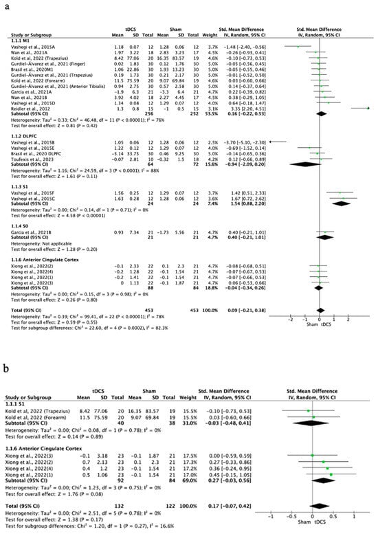 Forest plot of the results of a random-effects meta-analysis shown as SMD, with 95% confidence interval (CI) for the comparison of PPT in the a-tDCS group and the control group (a) and in the c-tDCS group and the control group (b). The shaded square represents the point estimate for each individual study and the weight of the study in the meta-analysis. The diamond represents the overall mean difference of the studies [,,,,,,].