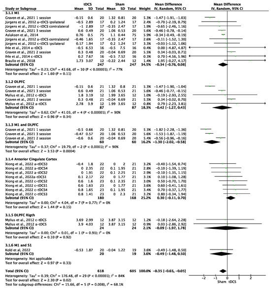The effects of tDCS on HPTs were significant in favor of the control group (MD = −0.35; 95% CI: −0.65 to −0.05; n = 1223; Z = 2.3; p = 0.02) (Figure 5). Heterogeneity was moderate to substantial (I2 = 84%; p < 0.001). The effects of a-tDCS on HPTs were significant in favor of the control group (MD = −0.53; 95% CI: −0.87 to −0.19; n = 899; Z = 3.06; p = 0.002; I2 = 88%; p < 0.001) (Figure 6), but non-significant in the case of c-tDCS compared to sham stimulation (MD = 0.25; 95% CI: −0.16 to 0.66; n = 363; Z = 1.2; p = 0.23; I2 = 0%; p = 0.74) (Figure 6). Subgroup analysis showed that there were significant differences between the stimulation sites for the overall tDCS (p = 0.008); it was observed that when tDCS was applied simultaneously to M1 and DLPFC, significant improvements occurred in favor of the sham stimulation (MD = −1.3; 95% CI: −2.02 to −0.58; n = 120; Z = 3.53; p < 0.001; I2 = 90%; p < 0.001). The sensitivity analysis performed only on studies with a low RoB could not be performed, since only one study included in this analysis showed a low risk of bias []. Sensitivity analysis eliminating studies for which the standard deviation (SD) was imputed with a correlation coefficient from other studies and in which a coefficient of 0.5 was used showed no significant differences between real and simulated stimulation (MD = −0.35; 95% CI: −0.92 to −0.21; n = 175; Z = 1.22; p = 0.22; I2 = 0%; p = 0.93). The analysis was performed in the studies of Jürgens et al., 2012 [], and Kold et al., 2022 []. The funnel plot showed asymmetry, indicating a possible risk of publication bias (Supplementary Material S4).