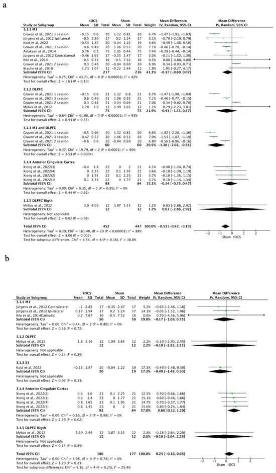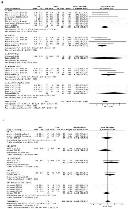Forest plot of the results of a random-effects meta-analysis shown as MD, with 95% confidence interval (CI) for the comparison of HPT in the a-tDCS group and the control group (a) and in the c-tDCS group and the control group (b). The shaded square represents the point estimate for each individual study and the weight of the study in the meta-analysis. The diamond represents the overall mean difference of the studies [,,,,,,].