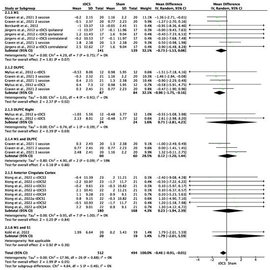 Forest plot of the results of a random-effects meta-analysis shown as MD, with 95% confidence interval (CI) for the comparison of HPT in the tDCS group and the control group. The shaded square represents the point estimate for each individual study and the weight of the study in the meta-analysis. The diamond represents the overall mean difference of the studies [,,,,,,].