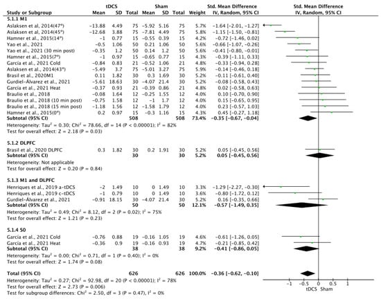Previous meta-analyses identified a modulatory effect of tDCS on increasing pain thresholds, but without differentiating among pain modalities [,]. A recent meta-analysis reported reduced evoked pain intensity following tDCS, but no impact on electrical, heat, cold, or pressure pain thresholds [].