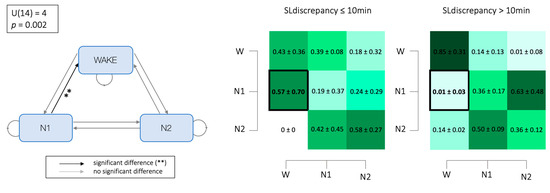 - Wei, Y.; Colombo, M.A.; Ramautar, J.R.; Blanken, T.F.; van der Werf, Y.D.; Spiegelhalder, K.; Feige, B.; Riemann, D.; Van Someren, E.J.W. Sleep Stage Transition Dynamics Reveal Specific Stage 2 Vulnerability in Insomnia. Sleep 2017, 40, zsx117. [Google Scholar] [CrossRef]