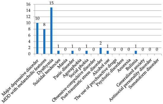 Out of 107 patients with DCA spectrum disorders, 40 (37.4%) patients had some psychiatric disorder. The most prevalent were dysthymia (14.2%), major depressive disorder (MDD) (9.4%), and MDD with melancholic features (7.6%). Post-traumatic stress disorder was detected in two patients (1.9%), while suicidal tendencies, social phobia, alcohol abuse, and bulimia were noted in individual cases. Other psychiatric disorders were not present (Table 1 and Figure 1).