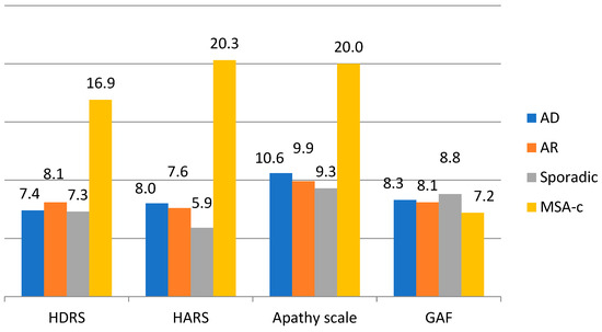 By far, the most pronounced symptoms of depression, anxiety, and apathy in our patients were those diagnosed with MSA-C compared to other subgroups of patients. Depression is one of the most prominent non-motor symptoms in multiple systemic atrophy. The prevalence of depression is over 50% in both motor subtypes of MSA [11,27]. It is believed that the cause is multifactorial and that, in addition to the influence of disability, the neurodegeneration of noradrenergic and cholinergic neurons contributes to the appearance of this disorder [28]. It was observed that patients in the AD ataxia group had a lower mean score on HDRS (7.4 ± 5.1) compared to the MSA and AR subgroups of patients and in the level of sporadic ataxias. The prevalence of depressive symptoms in patients with SCA ranges between 17 and 26%, and the frequency varies depending on the type of SCA [29,30]. SCA3 is the phenotype with the most common depressive symptoms and a degree of suicidal ideation [30]. The absence of this phenotype in our study may explain a low score on the HDRS scale. According to the results of Abele et al., the incidence of moderate and severe depression in SAOA patients ranges around 38% [31].