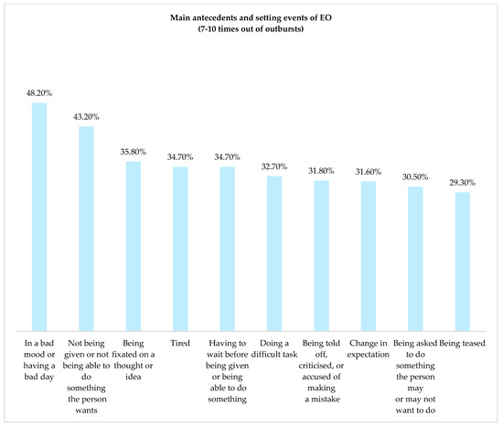 According to parents, the children in this study presented significant variability in contextual and individual factors, with more than 50 factors identified, 34 of which were always or almost always triggers of EOs (see Figure 2). The most frequent triggers were bad mood or having a bad day, not being given or not being able to do something the person wants, being fixated on a thought or idea, having to wait before being given or being able to do something, being tired, and doing a difficult task. These antecedents and setting events can be classified into a group defined as ‘States’ (setting events related to the physiological state of the individual, e.g., tired) or ‘Cognitive Demand’ (antecedents that may be cognitively demanding for an individual, e.g., change in expectation) [10]. In our sample, we identified triggers from the two clusters described by Chung et al. [10], with frequencies of occurrence that were higher than or equal to 25% in the frequently/always category.