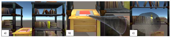 Screenshot of the Unity platform of (a) the scene; (b) the wormhole to reach the red book; (c) the wormhole to reach the yellow book.