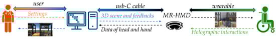 Acquisitions were conducted according to the following protocol (Figure 2): (i) The laptop was positioned on a table and the HL2 was connected by a 2 m USB-c cable; (ii) the patient was seated near the table and was wearing the holographic device; (iii) the Holographic Remoting mode was activated and the exergame started; (iv) the Unity interface showed in real time the patient’s point of view, and it made it possible to intervene with the exergame for personalization (i.e., changing the distance and height of the scene, changing the size of the wormhole); (v) at the end of the exergame, the project saved data of the acquisition in several txt files. After the exergame was stopped, the questionnaire was submitted, and demographic information was collected. Each subject tried the exercise as many times as necessary (maximum 3 times) to become familiar with the instrumentation, though only the last acquisition session was considered for the analysis. For this reason, other parameters such as fatigue and the learning effect were not evaluated on this occasion. We allowed participants to perform the motor tasks with their dominant limb because we were interested in assessing the execution of an everyday-life gesture that is naturally performed through the upper limb of the dominant side.