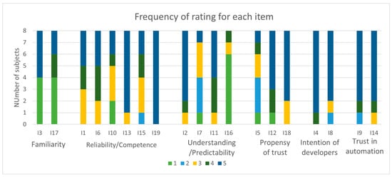 In conclusion, the TiA questionnaire was evaluated. Körber’s [30] questionnaire provides a total of 19 items grouped into six scales. Each scale evaluates a specific aspect of trust in automation which is consistently influenced by general propensity to trust, development experience, personality, and cultural background. For each item, an answer on a 5-point rating scale ranging between 1 (=strongly disagree) and 5 (=strongly agree) was provided. All the answers from all patients were analyzed, and the frequency of the rating point they gave for each item was evaluated.