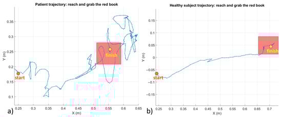 Example of hand trajectory on the horizontal plane (vision from above) during the first phase of the exercise: (a) patient, (b) healthy subject. The red square represents the book which is positioned a different distance in front of the user because of the personalization of the scenario. The blue line represents the trajectory of the hand that starts in the orange circle and stops in the green one.
