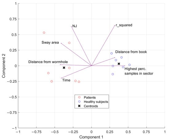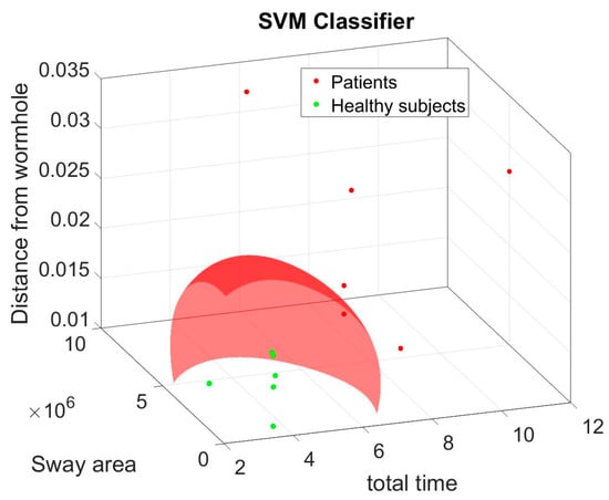 The total number of data points, plotted in the scatter plot (Figure 6), is less than the original number of subjects. This reduction is caused by the pre-processing of the data for the PCA. In particular, it is due to the elimination of outliers. From the interpretation of the incidence of each variable on PC1 [36], “time”, “sway area”, and “mean distance of the trajectory from the wormhole axis” turned out to be the variables that produced the most of the variance in the dataset. Thus, these variables were selected as the most representative of separation between healthy subjects and patients. The normalized jerk factor (NJ) and the “R_Square” variables were not included in classifier training because they stood in the middle of the two data point clouds. Eventually, the remaining variables were not included because they stood in the healthy group data point cloud. The original data belonging only to the selected variables were used to train a classifier. The result of the SVM classification based on the three variables is reported in Figure 7, showing the separation between healthy subjects and patients. To train the classifier, the original dataset was divided into a training and a test set according to percentages of 70% and 30%. The classifier had a F1-score of 100%.