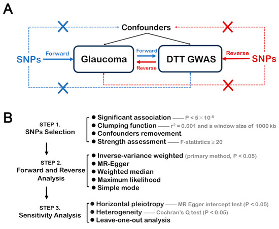 Study design and process of MR analysis. (A) Study design of bidirectional MR analysis between glaucoma and 206 traits based on DTT GWASs; (B) Process of MR analysis in three brief steps: SNPs selection, forward and reverse MR analysis, and sensitivity analysis. SNPs, single nucleotide polymorphisms; MR, Mendelian randomization; DTT, diffusion tensor tractography; GWAS, genome-wide association studies.