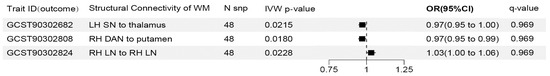 The results of our forward MR analysis suggested that glaucoma could lead to brain structural connectivity abnormalities, mainly in three DTT traits: GCST90302682, GCST90302808, and GCST90302824 (Figure 2). Our study indicated that glaucoma was negatively associated with brain structural connectivity from the LH SN to the thalamus (IVW OR = 0.972, 95% confidence interval [CI]: 0.949–0.996, p = 0.0215) and from the RH DAN to the putamen (IVW OR = 0.971, 95% CI: 0.947–0.995, p = 0.0180), whereas it was positively related to changes in brain structural connectivity from the RH LN to the RH LN (IVW OR = 1.031, 95% CI: 1.004–1.058, p = 0.0228). Additional analyses by the maximum likelihood test, simple mode, weighted median, and MR–Egger also demonstrated consistent causal estimates in the same direction (Supplementary Table S2). However, no significant causality was observed after the FDR adjustment (q > 0.05) for any phenotype. These three DTT traits offered novel evidence for the potential forward causality between glaucoma and DTT phenotypes, illustrating the impact of glaucoma on brain structural connectivity.