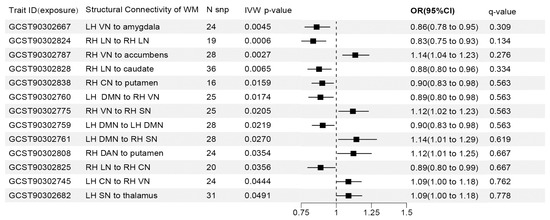 Causalities in the forward MR analysis between glaucoma and DTT traits. An IVW p-value < 0.05 was regarded as suggestive of causality and the false discovery rate (FDR) was used to adjust the results as the q-value. SNP, single nucleotide polymorphism; WM, white matter; RH, right hemisphere; LH, left hemisphere; IVW, inverse-variance weighted; CI, confidence interval; OR, odds ratio; SN, salience network; DAN, default mode network; LN, limbic network.