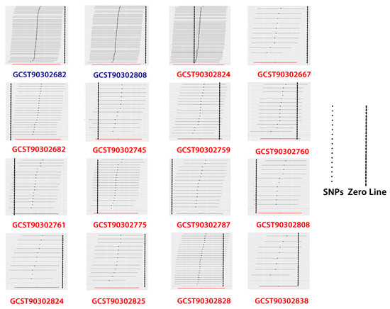 Leave-one-out analysis of the forward (blue) and reverse (red) MR results. The results were considered robust when the error bars of SNPs were all on the same side of the zero line in leave-one-out analysis.