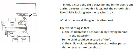 The questionnaire in this study included 10 items consisting of short stories accompanied by pictures (see Figure 1). The stories described diverse social situations, such as gossiping, bullying, violating privacy laws, and not sharing with a friend. The participant was asked to identify what was the worst thing in the specific situation. The question presented at the end of each story was a multiple choice question with four possible answers, one of which was correct. The participants scored one point for a correct answer and zero points for a wrong answer. The maximum possible score was 10 points. Cronbach’s alpha test reliability coefficient values for the CSCS are 0.68 for ages 6–7, 0.75 for ages 8–9, and 0.89 for ages 10–11. The validity of the test, according to the confirmatory fit index, is above 0.95 [63].