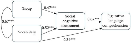 As shown in Figure 2, group affiliation and vocabulary are correlated, and both are associated with the social cognitive abilities of the children (as assessed by Hinting and CSCS). These social cognitive abilities, in turn, are linked to figurative language comprehension. Thus, social cognitive abilities serve as a mediating variable between group affiliation and vocabulary, influencing the children’s figurative language comprehension.
