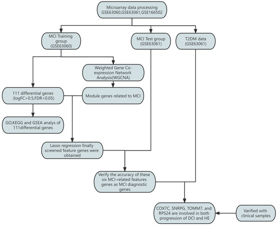 All MCI mRNA expression data were downloaded from the Gene Expression Omnibus database (GEO, https://www.ncbi.nlm.nih.gov/geo/ (accessed on 4 May 2023)). The GSE63060 (ftp://ftp.ncbi.nlm.nih.gov/geo/series/GSE63nnn/GSE63060/ (accessed on 4 May 2023)) dataset included 160 blood samples from patients with MCI and 104 from healthy controls. The mRNA expression data of this dataset were analyzed using the Illumina HumanHT-12 V3.0 expression BeadChip platform. GSE166502 (ftp.ncbi.nlm.nih.gov/geo/series/GSE166nnn/GSE166502/matrix/ (accessed on 4 May 2023)) includes 13 muscle cell samples from 13 patients with type 2 diabetes and 13 healthy controls. The mRNA expression data for this dataset were obtained using the Illumina HumanHT-12 BeadChip platform.