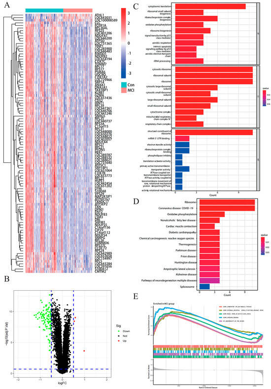 Differentially expressed genes (DEGs) between MCI and normal control samples, and functional enrichment analysis. The heatmap and volcano plot of DEGs were obtained by cluster analysis. (A) In the horizontal axis, Con represents the normal control group, MCI represents the cognitive impairment group, and the vertical axis represents the DEGs. (B) Volcano plot of differently expressed genes. Red indicates up-regulated genes, and green indicates down-regulated genes. Blue dotted line: Threshold coordinate line (C) GO terms. (D) KEGG pathways. (E) GSEA analysis of DEGs in the MCI group.