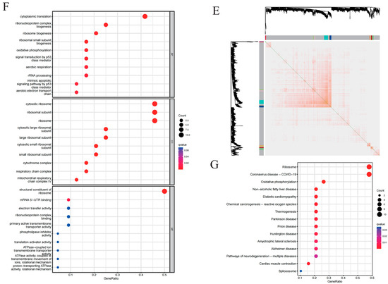 Previous studies have confirmed overlapping features of MCI and type 2 diabetes in cell metabolism, biological regulation, and other gene functions [21,22,23]. From a metabolic perspective, MCI is considered a fluctuation between high- and low-energy states [24]. Therefore, MCI development is closely related to energy metabolism in the brain. Studies have confirmed that the systemic insulin resistance observed in type 2 diabetes is reflected in the inability of cells to respond appropriately to insulin signals in the brain, which is manifested by impairment in cognitive areas such as executive function, memory, and processing speed [25]. This study was based on the GEO database from GSE63060, which contains whole-blood mRNA expression profile data; 160 MCI patients and 104 healthy participants matched for age and sex were included. First, six modules related to the MCI phenotype were obtained by WGCNA analysis, among which the blue module was the most related to MCI. Genes in the blue module were further analyzed using GO and KEGG. GO analysis showed that BP was mainly concentrated in cytoplasmic translation, ribosomal small subunit biogenesis, ribonucleoprotein complex biogenesis, and oxidative phosphorylation; CC was mainly concentrated in the cytosolic ribosome and ribosomal subunit. Ribosomes are essential for protein synthesis, and their dysfunction can lead to widespread cellular abnormalities. In the context of T2D-related MCI, abnormal ribosome function could contribute to cognitive impairment through several mechanisms, such as impaired protein synthesis, endoplasmic reticulum (ER) stress, altered insulin signaling, and mitochondrial dysfunction. These findings highlight the complex interplay between ribosomal function, metabolic regulation, and cognitive health, suggesting that targeting ribosomal pathways could be a novel approach to preventing or treating T2D-related MCI; MF was mainly concentrated in the structural constituent of the ribosome and mRNA 5’UTR binding. The KEGG pathways involved were mainly ribosomes, COVID-19, oxidative phosphorylation, non-alcoholic fatty liver disease, and diabetic cardiomyopathy.