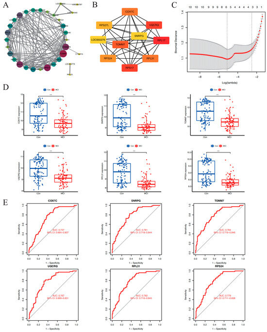 PPI network construction and key genes screening. (A), Diagram of protein–protein interaction (PPI) network of the blue module. The degree of the node was reflected by its size and color. The larger the node, the deeper the color from yellow to purple, and the greater the degree. (B), the network diagram of the top 10 genes screened via the MCC algorithm. The darker color, from yellow to red, represented a greater score. (C), LASSO screening analysis of related genes in the blue module. (D), Difference analysis of COX7C, SNRPG, TOMM7, UQCRQ, RPL31, and RPS 24 expressions in MCI and normal control group. (E), ROC curve detection of COX7C, SNRPG, TOMM7, UQCRQ, RPL31, and RPS24 to predict the occurrence of MCI. Significance: ***, p < 0.001.