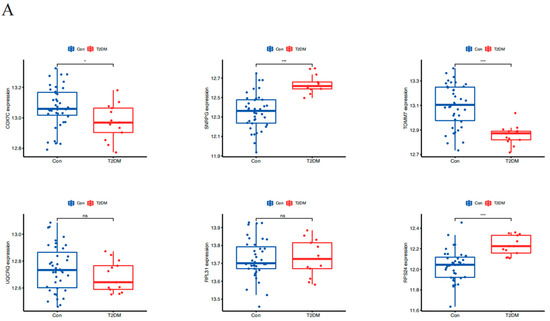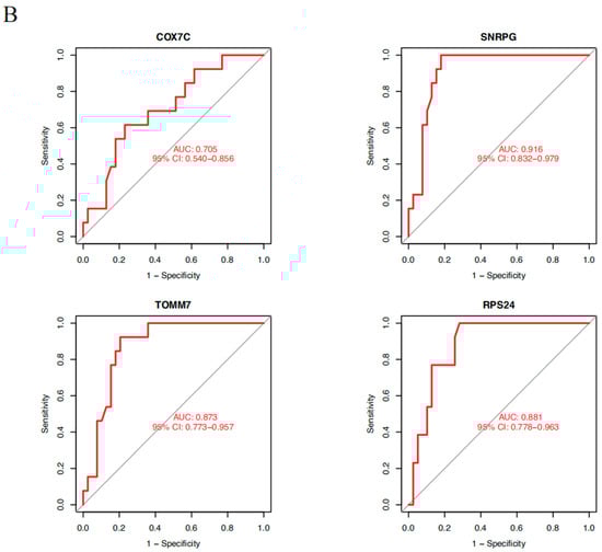 The t-test results showed that the expression levels of four genes (COX7C, SNRPG, TOMM7, and RPS24) were significantly different between the type 2 diabetes and control groups (p < 0.05) (Figure 5A). The ROC curve was used to verify the diagnostic value of these four genes in type 2 diabetes (Figure 5B). The results were COX7C (AUC = 0.705; 95% CI: 0.540–0.854), SNRPG (AUC = 0.916; 95% CI: 0.832–0.980), TOMM7 (AUC = 0.873; 95% CI: 0.769–0.959), and RPS24 (AUC = 0.881; 95% CI: 0.778–0.963).