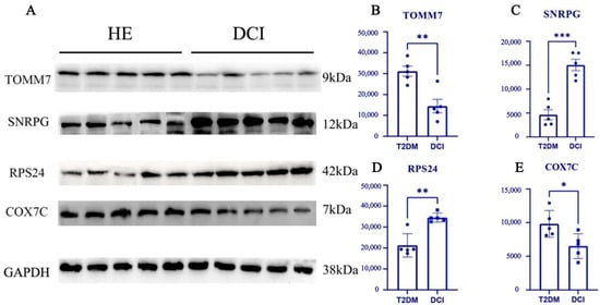 (A) Validation of 4 diagnostic feature biomarkers in clinical tissues via Western blot analysis. The expression of (B), TOMM7, (C), SNRPG, (D), RPS24, and (E), COX7C. Statistical significance: *p < 0.05; **p < 0.01; ***p < 0.001.