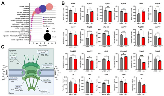 22]. GO pathways were manually examined for terms related to the NCT machinery and representative terms were chosen for graphical representation. Genes from these chosen pathways were identified, and normalized gene counts for each gene of interest from siNEG- and siA1-treated cells were plotted and individually analyzed to identify significant changes in gene expression.