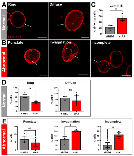 29]. The percent of abnormal phenotypes was calculated by adding the counts of the different abnormal phenotypes and dividing by the total number of cells counted (n = 30–40 cells per replicate per group). The mean percentage of abnormal staining phenotypes between the siNEG and siA1 groups was compared using one-tailed, independent