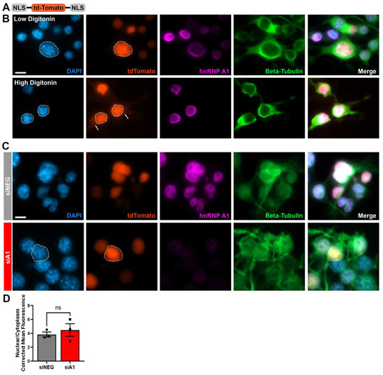 38]. We found that hnRNP A1 knockdown significantly altered NCT, wherein there was an increase in tdTomato cytoplasmic signal with siA1 treatment compared to siNEG treatment. NCT is critical for cellular homeostasis, and small changes in this process may impact the ability of macromolecules to properly traffic to locations within the cell, leading to detrimental consequences. Further, a commonality amongst neurodegenerative diseases is disrupted NCT, which may suggest that underlying RBP dysfunction in these diseases initiates or exacerbates problems with transport.