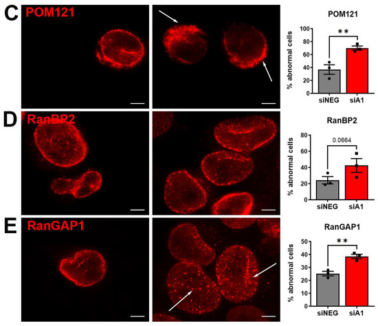 41]. This creates the possibility that abnormal distribution of Nups like Nup98 may also impact NPC function. Additionally, we found increased RanGAP1 within the nucleus following siA1 treatment. RanGAP1 normally surrounds the nuclear envelope and is within the cytoplasm, and assists with transport of proteins from the cytoplasm to the nucleus. Accumulation and aggregation of nuclear RanGAP1 is abnormal and suggests that it is no longer capable of efficiently transporting cargo into the nucleus. Disrupted distribution of RanGAP1 has been previously observed in neurodegenerative disease, and may be indicative of defects in NCT [