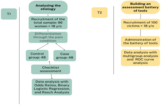 This specific set of tools will be validated using structural equation models, considering only the total score of each questionnaire. This will help establish how this type of pain is defined by the dimension investigated through the used tools. A multigroup analysis will be conducted to determine which questionnaire is better suited for the sample and for the aim of the project. Through ROC curve analysis, it will be possible to distinguish between cases with pain and those without pain. At the end of this process, it will be possible to establish a total diagnostic cut-off. The analysis will be performed with Jamovi software. (See the following flowchart to understand the different phases of the project, Figure 1).